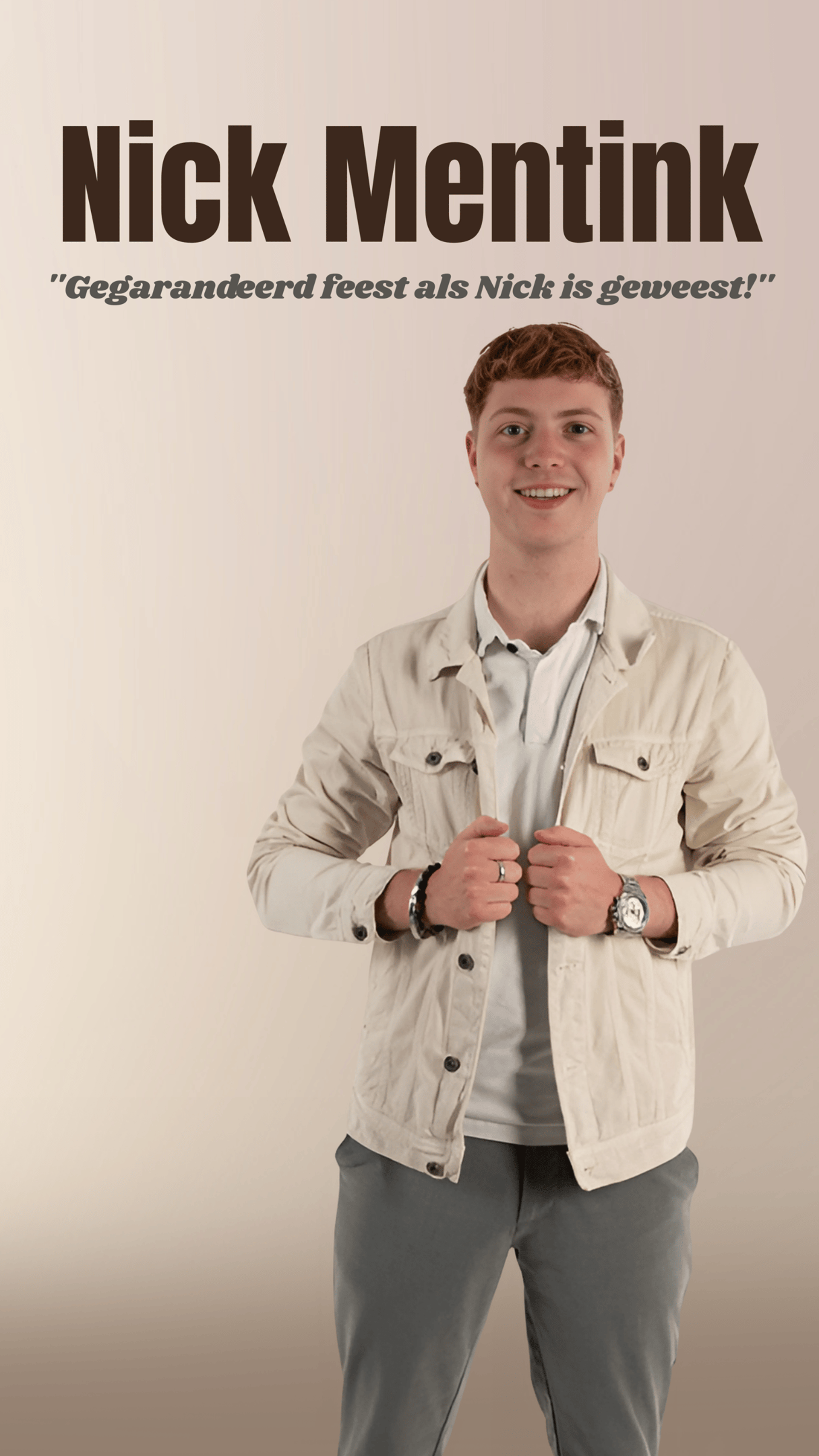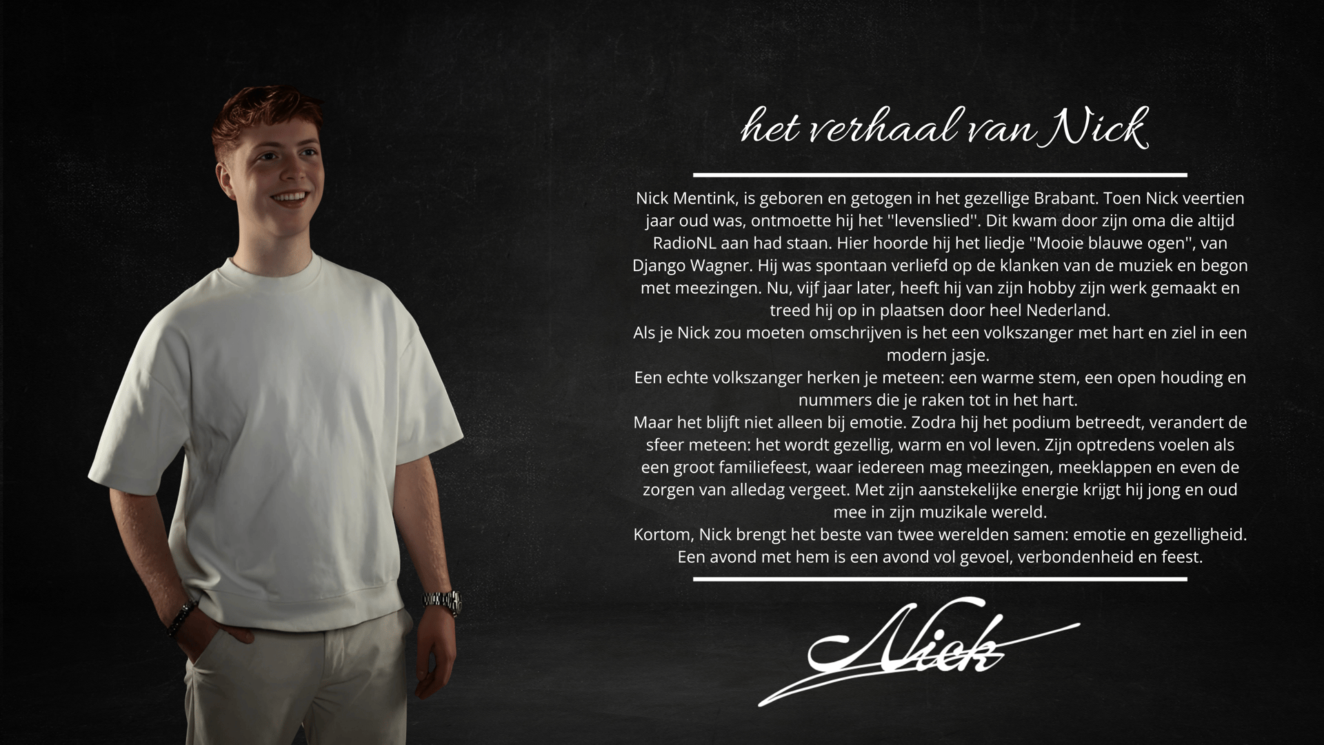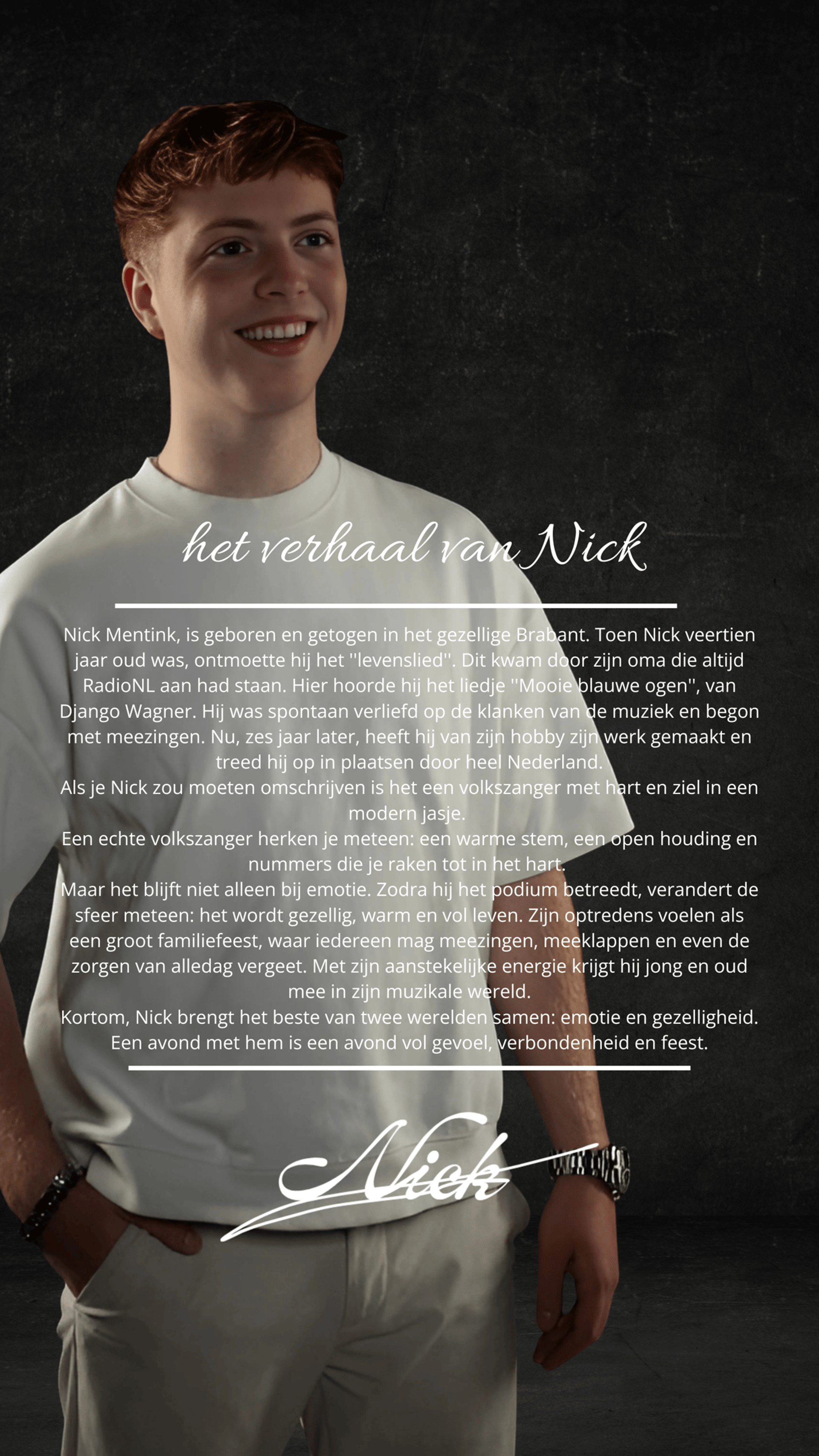 Door je in te schrijven ontvang je de meest actuele informatie over Nick, van optredens tot aan nieuwste muziek! De nieuwsbrief neemt ook exclusieve content met zich mee zoals achter de schermen content en persoonlijke verhalen. Speciale acties en winacties voor optredens. Je krijgt als eerste nieuwe releases in je inbox. Persoonlijke berichten vol positiviteit, gezelligheid en sfeer! Blijf op de hoogte en hopelijk zien we je snel!